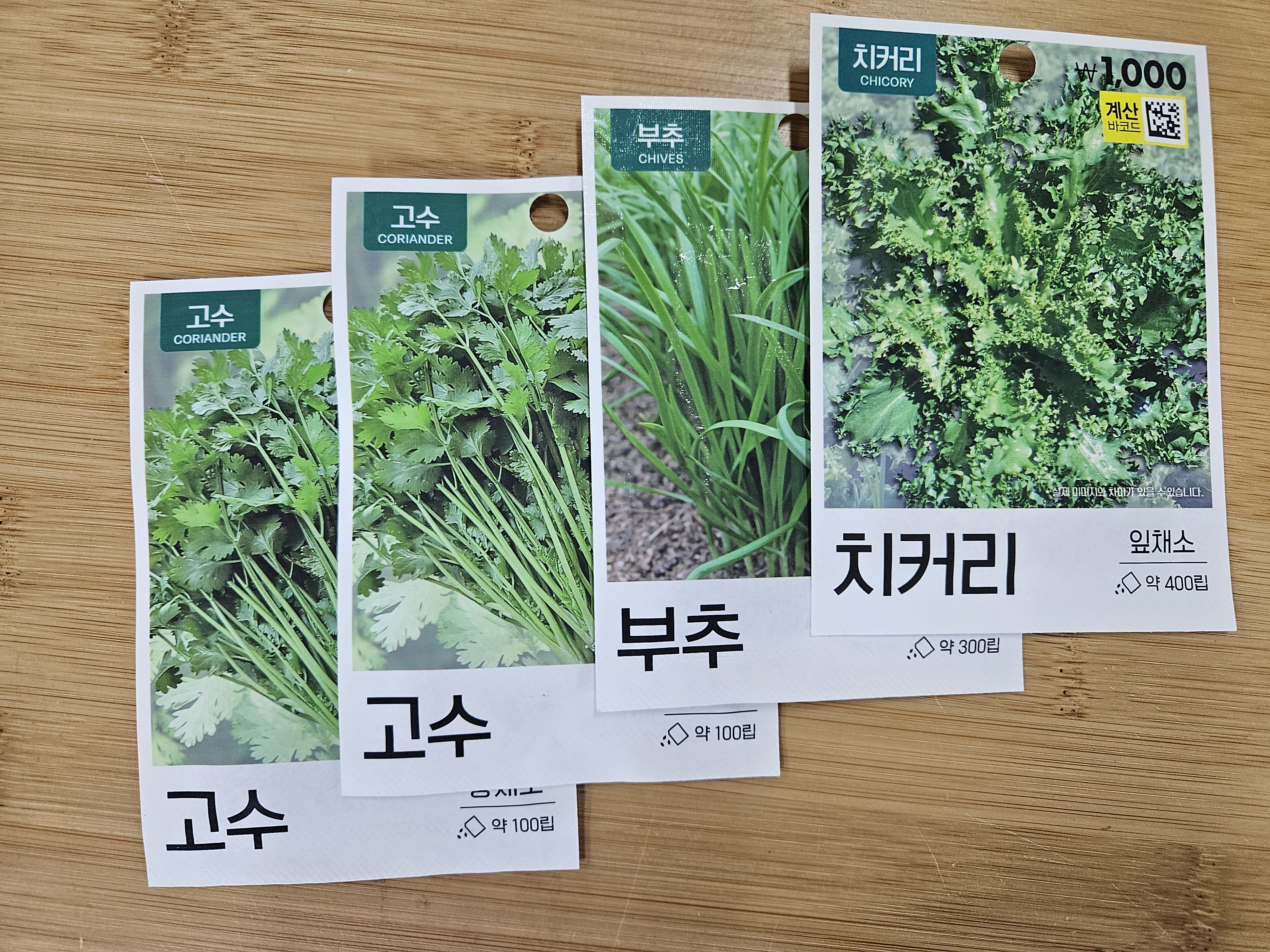 - 씨앗 종류: 레드치커리, 케일, 로켓루꼴라, 시금치, 로즈마리, 레몬밤, 고수, 부추, 치커리 (총 9종)