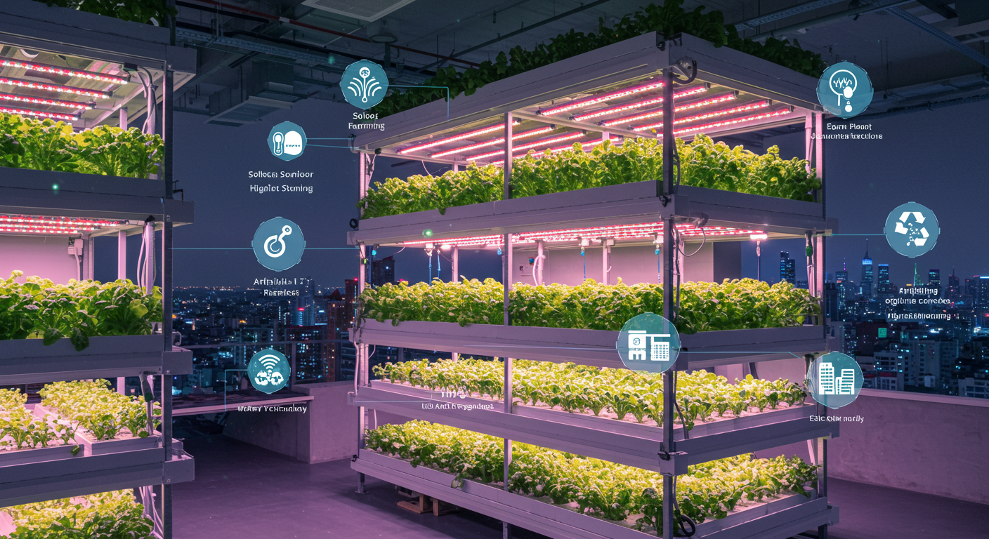 수직 농장은 한정된 공간에서 최적의 환경을 조성하여 농작물을 재배하는 방식으로, 스마트팜 기술을 활용해 더 적은 물과 토지를 사용하면서도 높은 생산성을 유지할 수 있습니다.